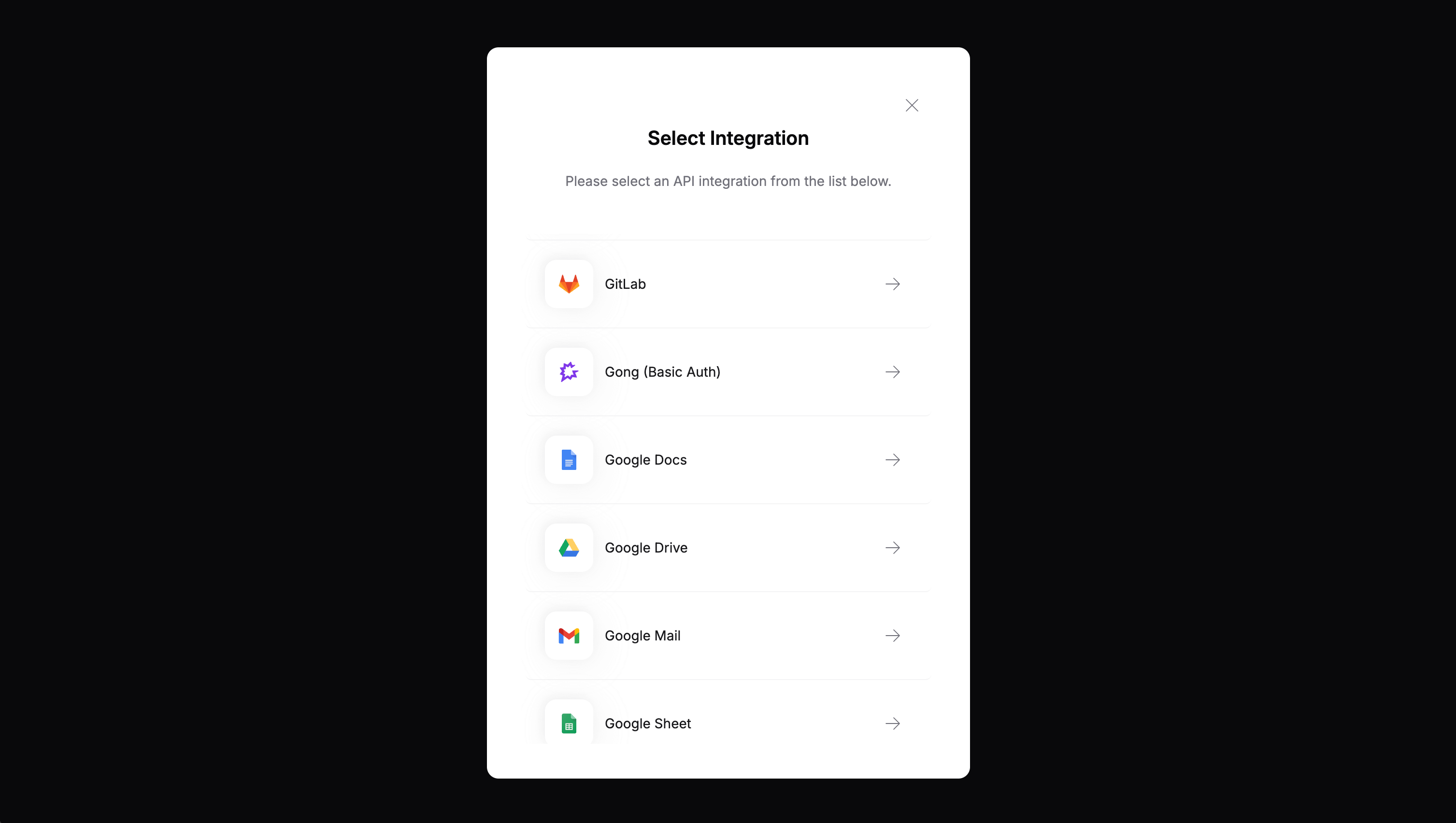 Passing a list of integration IDs in allowed_integrations will display a list of integrations that the end user can pick from: