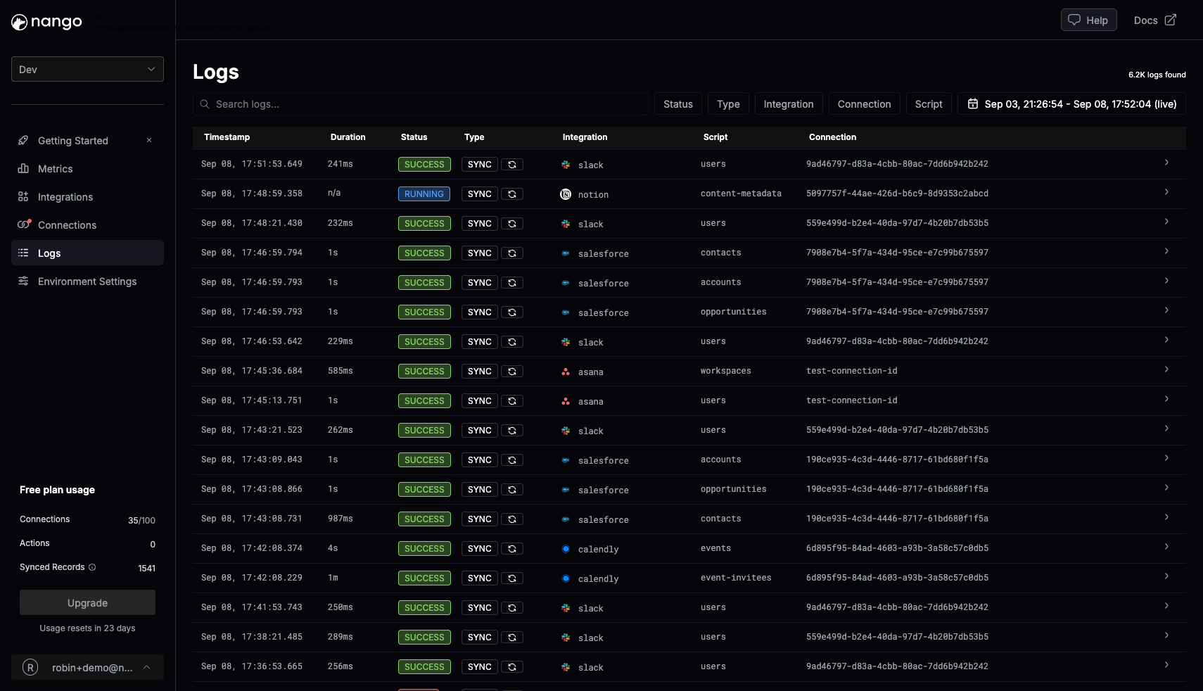 Since integrations rely on third-party APIs, production issues are bound to happen. When you encounter a problem, great observability is the difference between a week-long needle-in-a-haystack hunt and a timely resolution. We built Nango’s logs based on three principles:- Comprehensive: Everything that happens in Nango for your integrations produces an “operation” in the logs