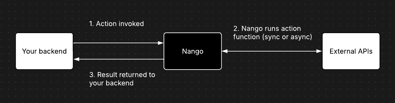 - Actions are invoked from your backend and run in the context of a Connection (API key or access token of your user)