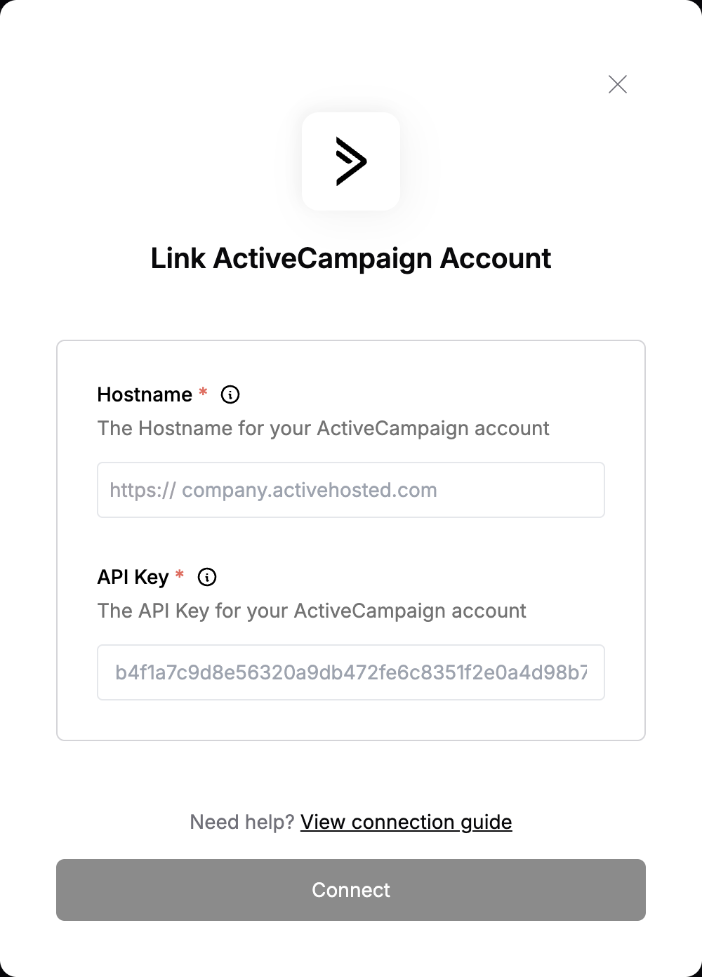 To authenticate with ActiveCampaign, you need:- Hostname - The Hostname to your ActiveCampaign instance.