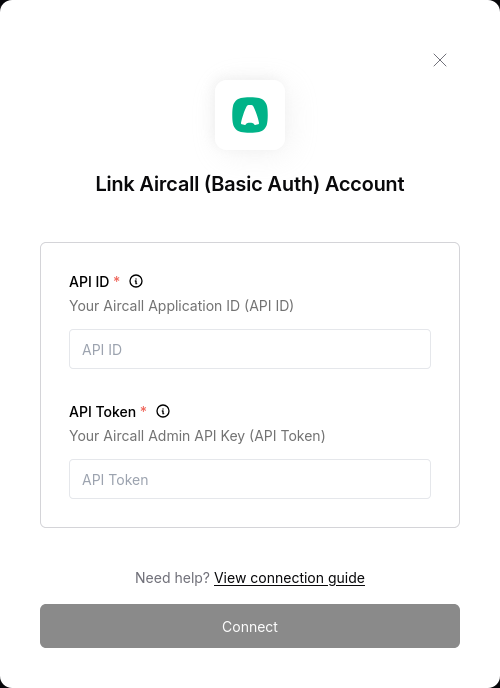 To authenticate with Aircall (Basic Auth), you need two key pieces of information:- API ID - A unique identifier for your application on Aircall.