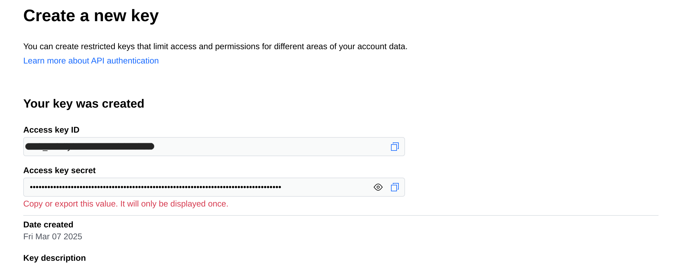 - Copy the generated key pair and store it securely. You will need it for the next steps