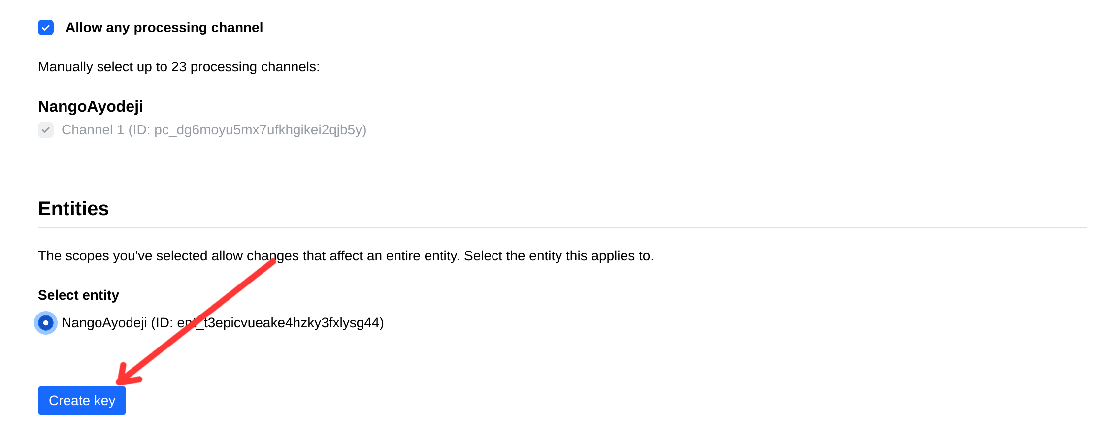 - Select the entity you want to create the key for and then click on the Create key button.