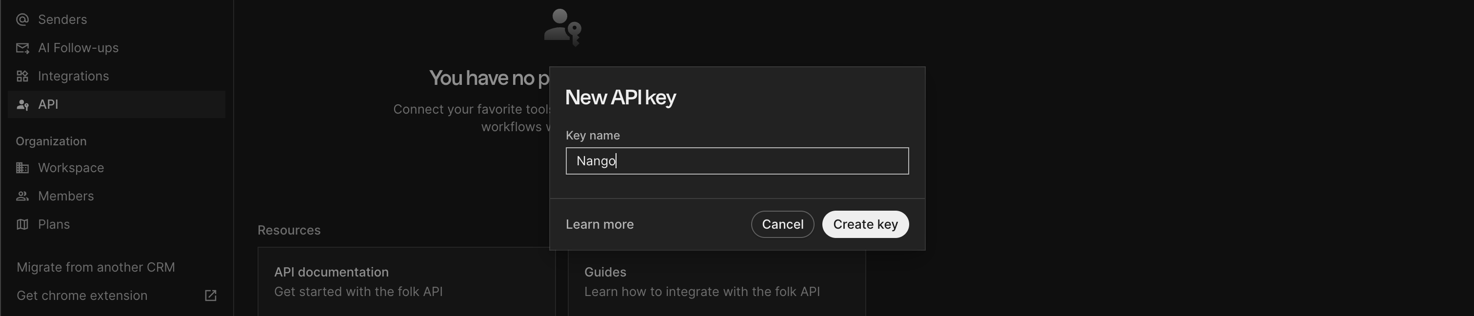 To authenticate with Folk, you need:- API Key - A key that grants Nango permission to interact with Folk’s API.