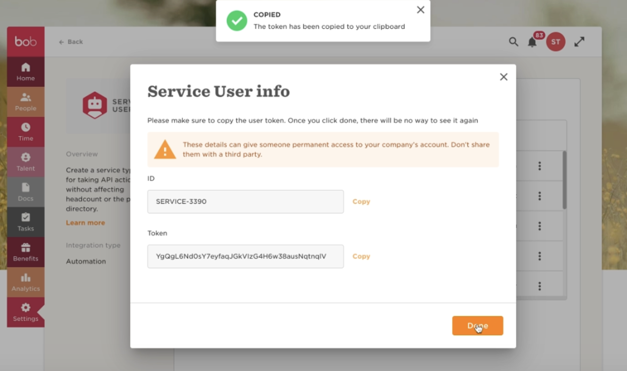 To authenticate with Hibob, you need two key pieces of information:- Token - A key that grants access to your application and configurations.