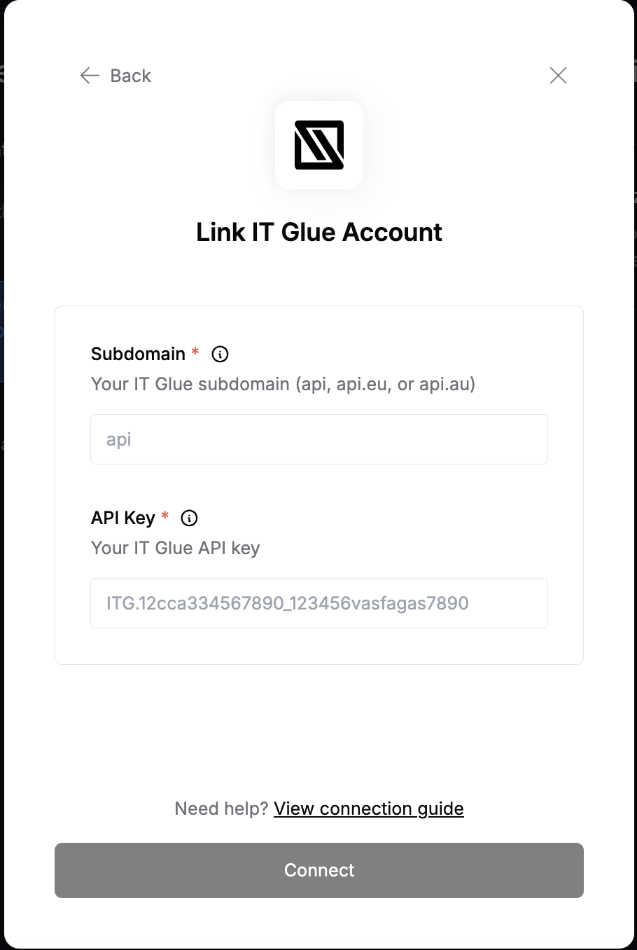 - Subdomain - Your IT Glue subdomain (api, api.eu, or api.au).
