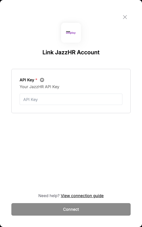 To authenticate with JazzHR, you need:- API Key – A key that grants Nango secure access to interact with JazzHR resources and services.