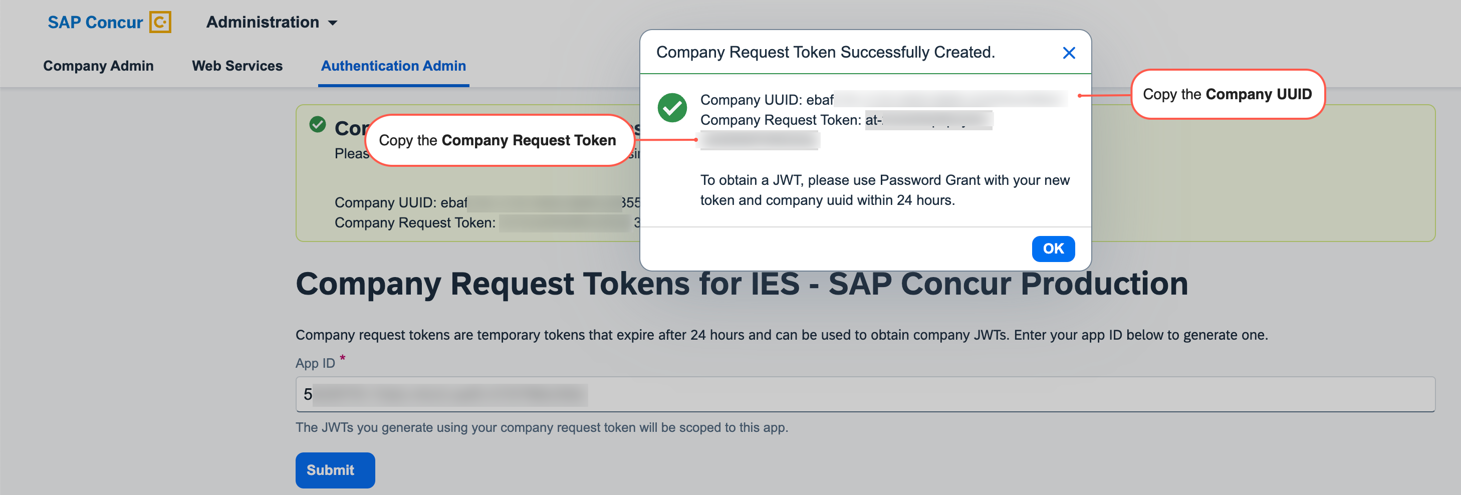 - In the admin panel, go to[Company Request Tokens]/(https://www.concursolutions.com/nui/authadmin/companytokens)