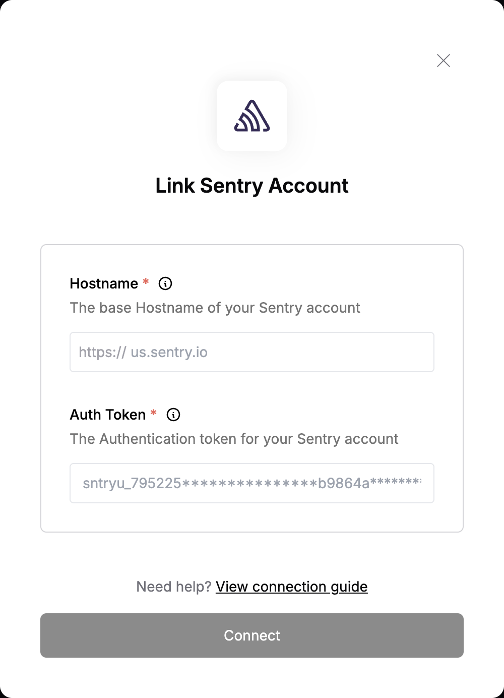 To authenticate with Sentry, you will need:- Hostname - The Hostname to your Sentry account.