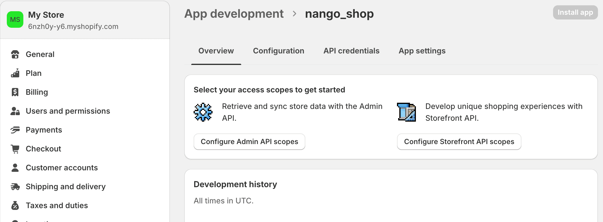 - In the Overview tab, select at least a single scope from either Admin or Storefront API scopes, or both, depending on the app’s requirements.