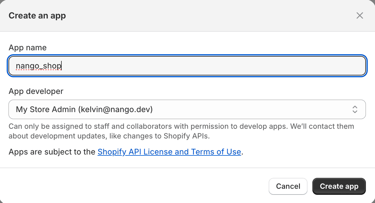 - In the modal window, enter the App name and select an App developer. The app developer can be the store owner, or any staff or collaborator account with the Develop apps permission.