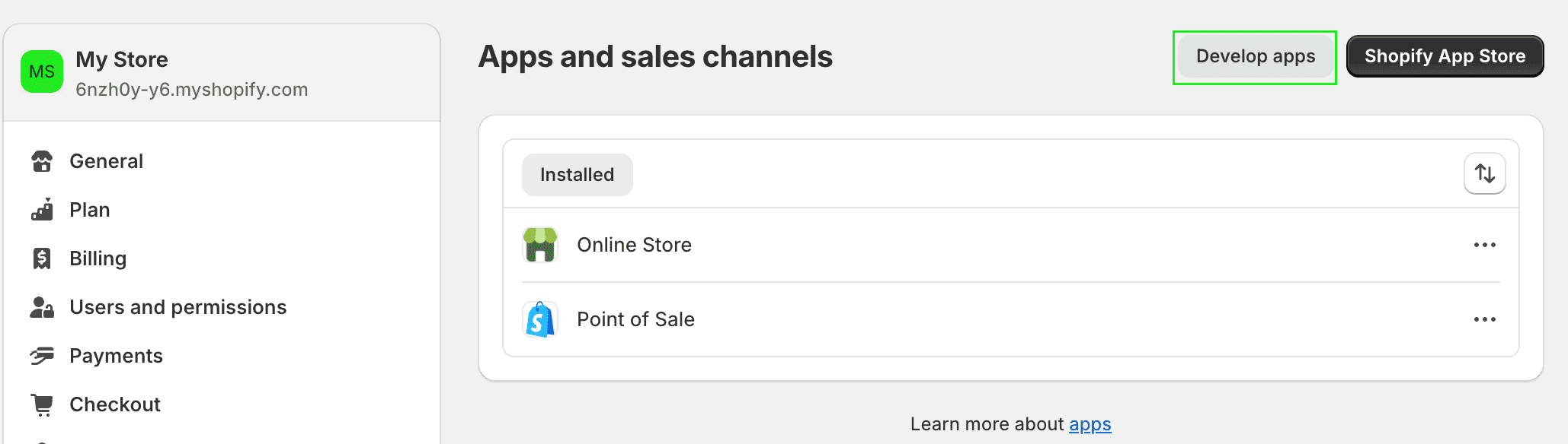 - From your Shopify admin, go to Settings > Apps and sales channels.