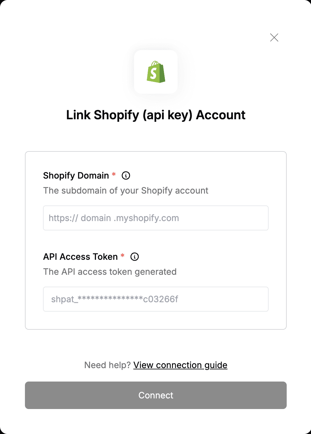 - Enter the Shopify Domain and API Access Token in their respective fields.