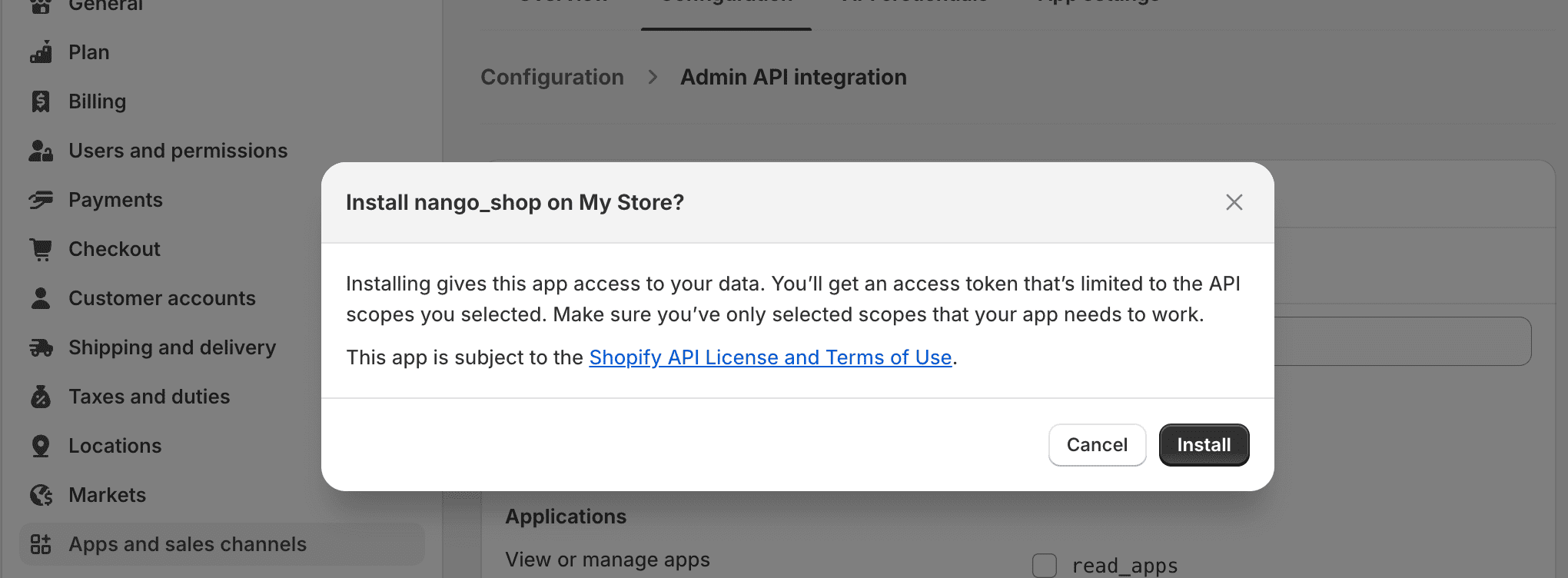 - After you’ve activated custom app development, you can create and install a custom app in your Shopify admin.